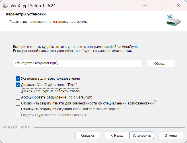 5. По умолчанию программа предложит папку C:\Program Files\Veracrypt