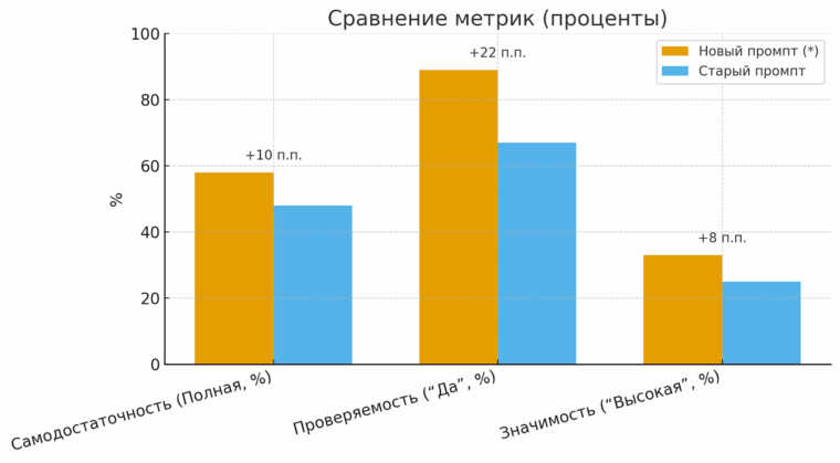 График показывает, что новый промпт улучшил все три ключевые метрики. Особенно заметен скачок в проверяемости — на 22 процентных пункта. Это значит, что теперь почти 9 из 10 утверждений, которые выделяет бот, действительно можно проверить по источникам.
