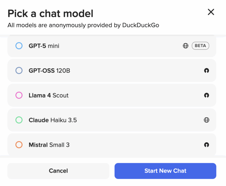 Отдельного внимания заслуживают ИИ-инструменты DuckDuckGo, которые доступны в разделе Duck.AI. Кроме помощника с поиском есть интересная возможность — анонимное общение со сторонними чат-моделями. В ИИ-разделе доступны GPT, Claude, Mistral и Llama. DuckDuckGo выступает анонимным посредником: ваши запросы передаются моделям, но без вашей идентификации. Это важно, если вы работаете с конфиденциальными данными.